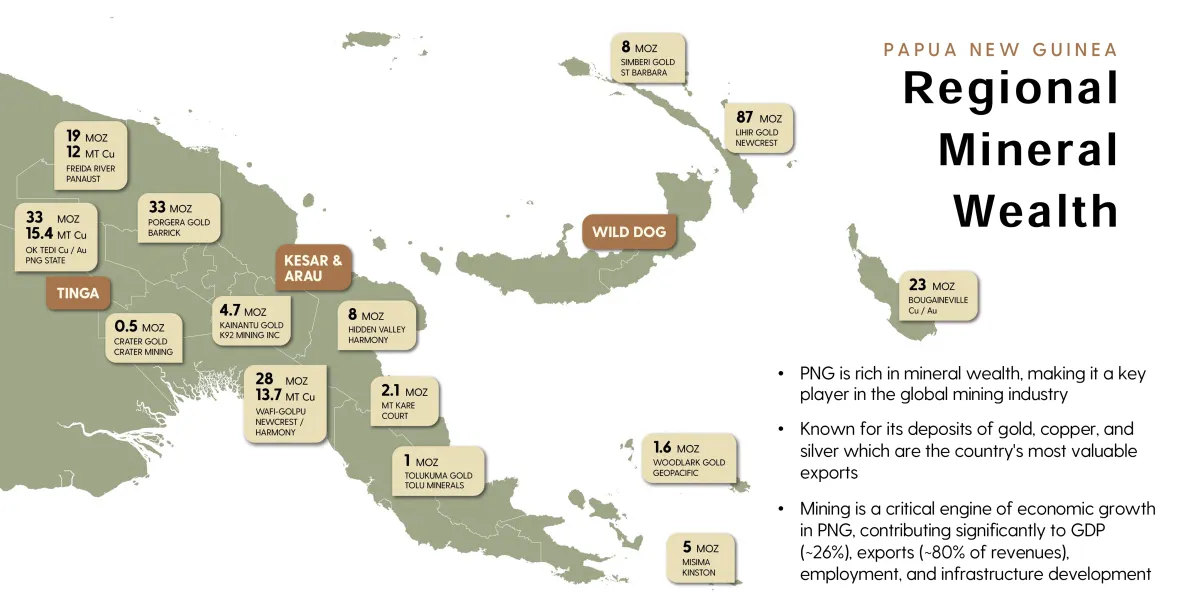 Tier-1 land position in PNG, near existing or past producing mines, with walk-up drill targets and major discovery potential across three district-scale projects: Wild Dog, Kesar Creek, and Arau.